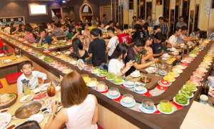 Vị trí ngồi là then chốt: Hãy ưu tiên chọn chỗ ngồi gần khu vực “cửa ra đồ” của bếp. Đây là vị trí chiến lược giúp bạn “đón đầu” được những đĩa thịt bò Mỹ tươi nhất, những khay hải sản vừa được sơ chế trước khi chúng phải đi qua hàng chục thực khách khác trên băng chuyền.