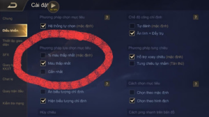 Chọn “Hệ thống chỉ định” (Máu thấp nhất) cho người mới. Nâng cao hơn thì chọn “Ăn lính đẩy trụ” (hiện 3 nút đánh lính, đánh trụ, đánh người) – cái này BẮT BUỘC phải dùng để tránh việc muốn đánh trụ mà tướng lại lao vào đánh địch. Nếu chỉ có 1 nút đánh thường, hệ thống sẽ tự chọn mục tiêu theo thuật toán (thường là tướng địch).