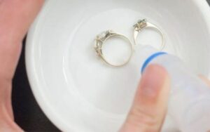 - Nhỏ trực tiếp 1-2 giọt giấm lên một góc khuất của sản phẩm (ví dụ như mặt trong lòng nhẫn, mặt sau mặt dây chuyền) hoặc ngâm hẳn phần kim loại vào một chén giấm nhỏ trong khoảng 15 phút.