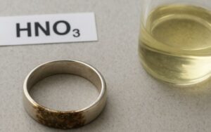 Đây là phương pháp tiêu chuẩn mà nhiều thợ kim hoàn sử dụng để kiểm tra nhanh. Về bản chất hóa học, Vàng (Au) là một kim loại quý, đứng cuối của dãy hoạt động hóa học. Vàng có tính “trơ” và không phản ứng với Axit Nitric đơn lẻ (chỉ tan chảy trong dung dịch Nước Cường Toan – hỗn hợp Axit Nitric + Axit Clohydric ).