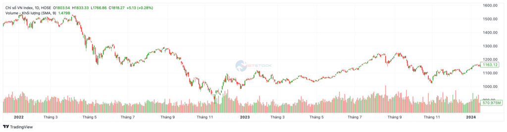 Năm 2022 – Rơi tự do và Khủng hoảng giải chấp chéo: Khi dòng tiền rẻ bị rút đi và các vụ án kinh tế vỡ lở, thị trường chứng kiến những đợt bán tháo kinh hoàng. Hiện tượng “Call Margin chéo” (bán giải chấp cổ phiếu tốt để bù đắp cho cổ phiếu bất động sản mất thanh khoản) khiến thị trường tắm máu. VN-Index cắm đầu rơi từ 1.500 điểm xuống tạo đáy sâu nhất tại 873.78 điểm vào giữa tháng 11/2022 (bốc hơi hơn 43% từ đỉnh).