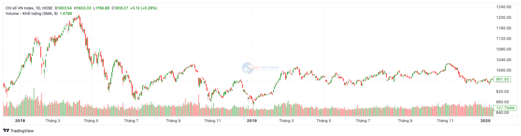 Trượt dốc và Đi ngang (Nửa cuối 2018 – 2019): Ngay sau khi lập đỉnh, áp lực bán ròng rã của khối ngoại và nỗi lo suy thoái toàn cầu đã đẩy chỉ số rơi mạnh về quanh vùng 900 điểm. Xuyên suốt năm 2019, chỉ số VNIndex gần như chỉ đi ngang trong một biên độ rất hẹp từ 950 đến 1.000 điểm. Dòng tiền phân hóa cực mạnh, thị trường không có sóng ngành dẫn dắt rõ rệt.