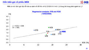 Định giá P/B (Giá trị sổ sách): Hiện cổ phiếu MBB đang giao dịch ở mức P/B khoảng 1,6 lần (tại thời điểm tháng 2/2026), thấp hơn mức trung bình ngành là 1,7 lần. Với một ngân hàng có ROE ~21% và tăng trưởng tín dụng 35%, mức định giá này được coi là cực kỳ hấp dẫn cho nhà đầu tư dài hạn.