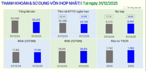 | Tổng Tài sản | 53.312 | 55.049 | -3,2% | Quy mô tài sản giảm nhẹ do giảm tiền mặt để trả cổ tức và nợ vay. |