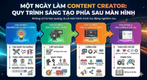 Rất nhiều bạn trẻ ngày nay bị hấp dẫn bởi ánh hào quang rực rỡ của nghề này mà chưa hình dung hết khối lượng công việc thực sự phía sau màn hình. Làm Content Creator không đơn giản chỉ là cầm máy lên và quay, mà là cả một quy trình lao động nghiêm túc và bài bản, bao gồm 4 giai đoạn chính dưới đây.