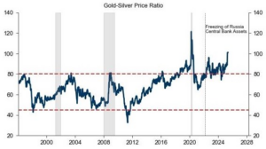 - Tỷ lệ Giá Vàng/Bạc (Gold/Silver Ratio): Dù bạc tăng giá, tỷ lệ này hiện vẫn ở mức cao (Vàng 190tr / Bạc 4,54tr ≈ 42 lần). Lịch sử cho thấy, khi kim loại quý bước vào “siêu chu kỳ tăng giá”, tỷ lệ này thường có xu hướng thu hẹp về mức 20 – 30 lần. Điều này hàm ý rằng: Dư địa tăng trưởng của Bạc vẫn còn rộng mở hơn rất nhiều so với Vàng.